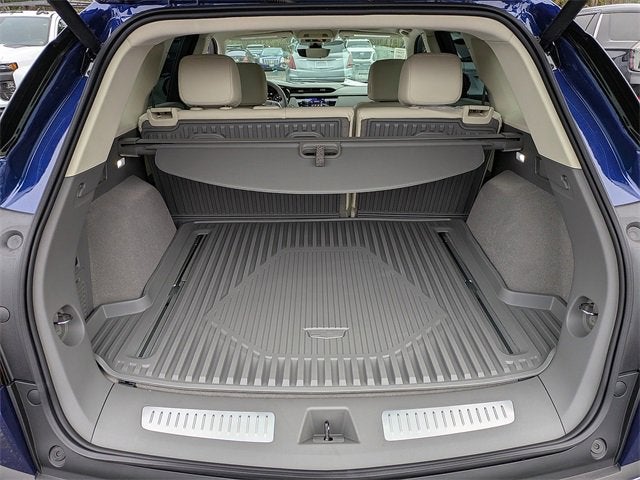 - Opens or closes when the system senses the key fob and the driver extends their foot under the left-hand side of the rear bumper over an image of the Cadillac Crest projected under the vehicle