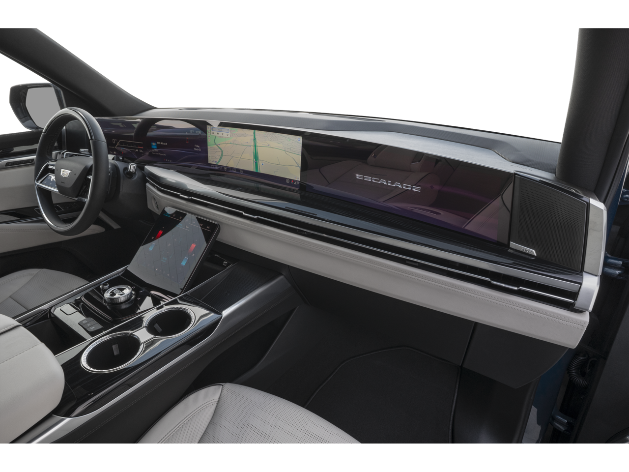 Stepping inside, you'll be enveloped in a world of refined comfort and advanced technology. The Escalade Sport's cabin is adorned with premium materials and features, including a 19-speaker AKG Studio audio system, a reconfigurable full-color head-up display, and a panoramic sunroof that floods the interior with natural light.
