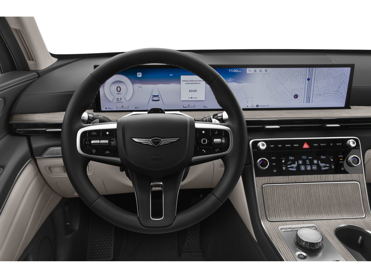 - Radio: AM/FM/SiriusXM/HD -inc: premium audio w/12 speakers, 27" integrated OLED instrument cluster and navigation system, SiriusXM Radio w/90-day subscription (not available in AK or HI), cloud connected platform (cloud profiles, connected routing, dynamic voice recognition, OTA updates), wireless Apple CarPlay, wireless Android Auto, Bluetooth® hands-free phone system w/audio streaming, wireless phone charger, Wi-Fi hotspot, steering wheel controls, USB and Genesis Connected Services Wireless Apple CarPlay and wireless Android Auto are late availability.